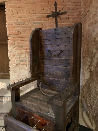 Buongiorno! Per la rubrica “Posti che ispirano la scrittura” oggi vi parlo del Castello di Piovera, in provincia di Alessandria, Piemonte. Ci sono stata a metà novembre, in occasione della mostra “Antichi strumenti di tortura”. Nella sala dedicata alla mostra si potevano osservare i vari strumenti usati negli antichi tribunali civili ed ecclesiastici; dalla maschera dell’infamia, al collare spinato, alla sedia inquisitoria, al palo della fustigazione e molti altri. L’esposizione dello strumento era accompagnata dalla spiegazione di come veniva usato. Ho trovato questa mostra interessante e, personalmente, utile al libro che sto scrivendo “Stratum. Potestas”. Non voglio darvi troppe anticipazioni ma, senza entrare nel dettaglio, due capitoli richiedevano una documentazione approfondita sull’uso di alcuni strumenti di tortura.